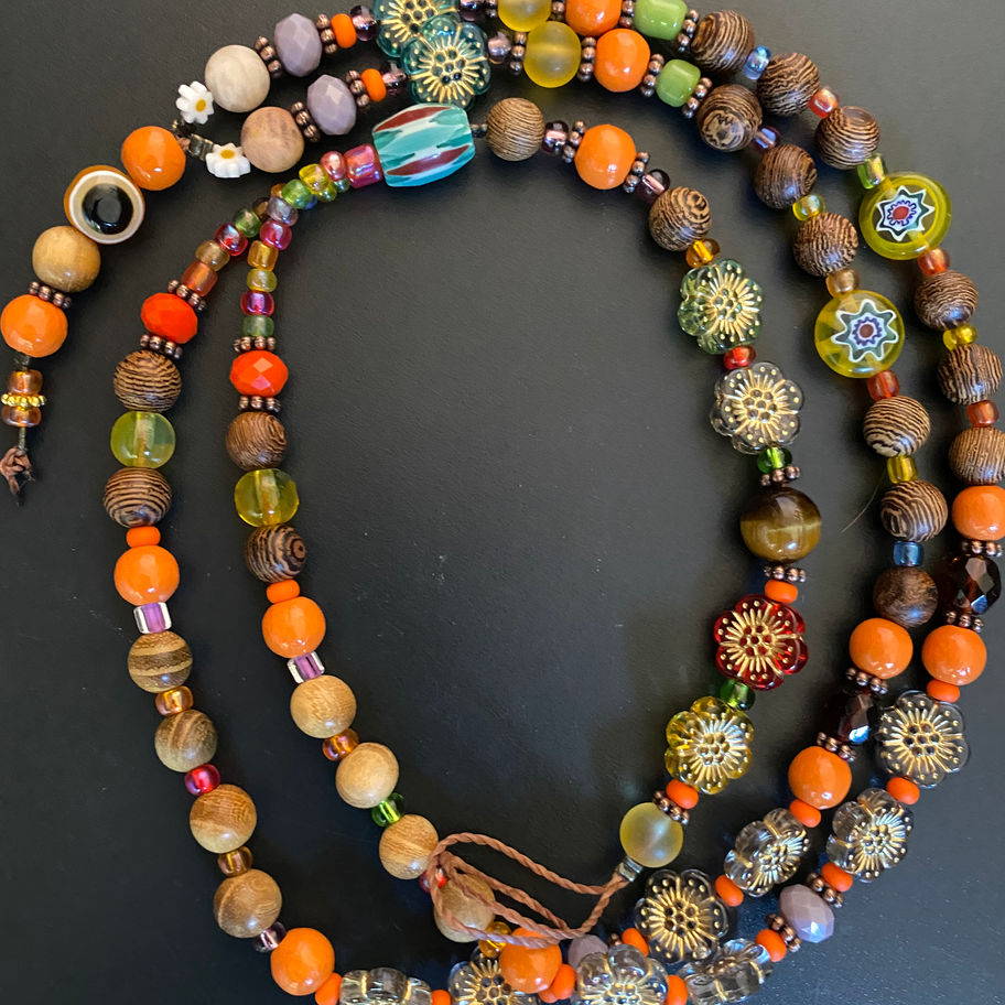 Un subtil mélange de perles , de perles anciennes , de pierres fines , semi-précieuses et en différentes essences de bois.
